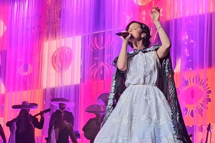 El cierre de la noche llegó con un vestido blanco de bordados florales, acompañado de una capa gris con estrellas que luego cambió por un rebozo verde esmeralda. Este atuendo, usado durante los temas de mariachi y las baladas más emotivas, buscó rendir homenaje a la tradición mexicana.