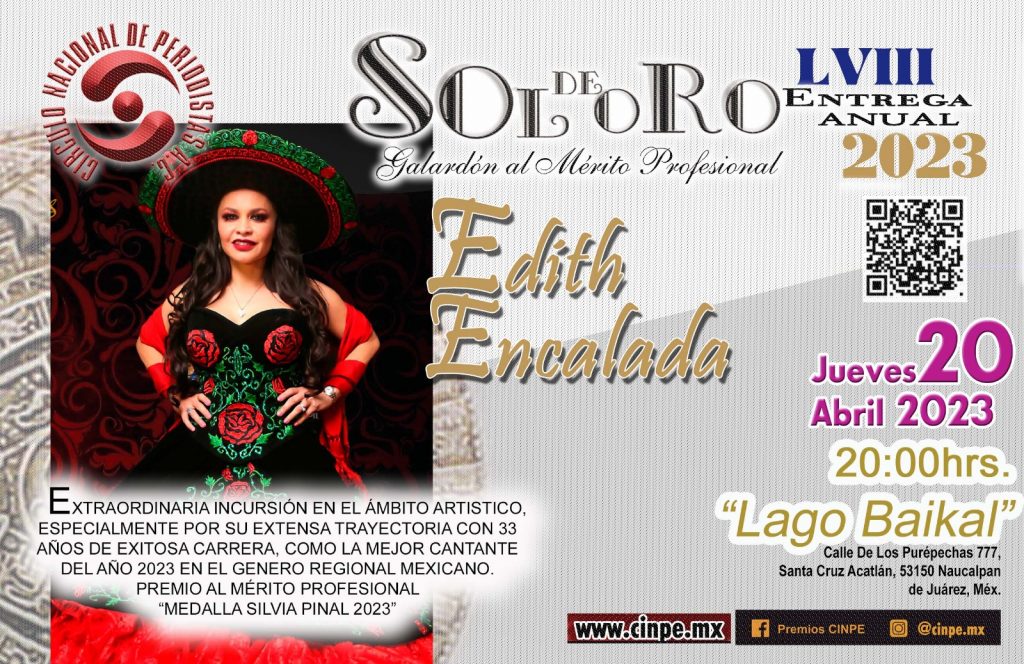 Por su esfuerzo y calidad profesional y especialmente por su extensa trayectoria con 33 años de exitosa carrera la cantante Edith Encalada será galardonada con la Medalla “Silvia Pinal”, durante la 58 Entrega del Sol de Oro 2023, que avala el comité ejecutivo del CINPE (Círculo Nacional de Periodistas AC).