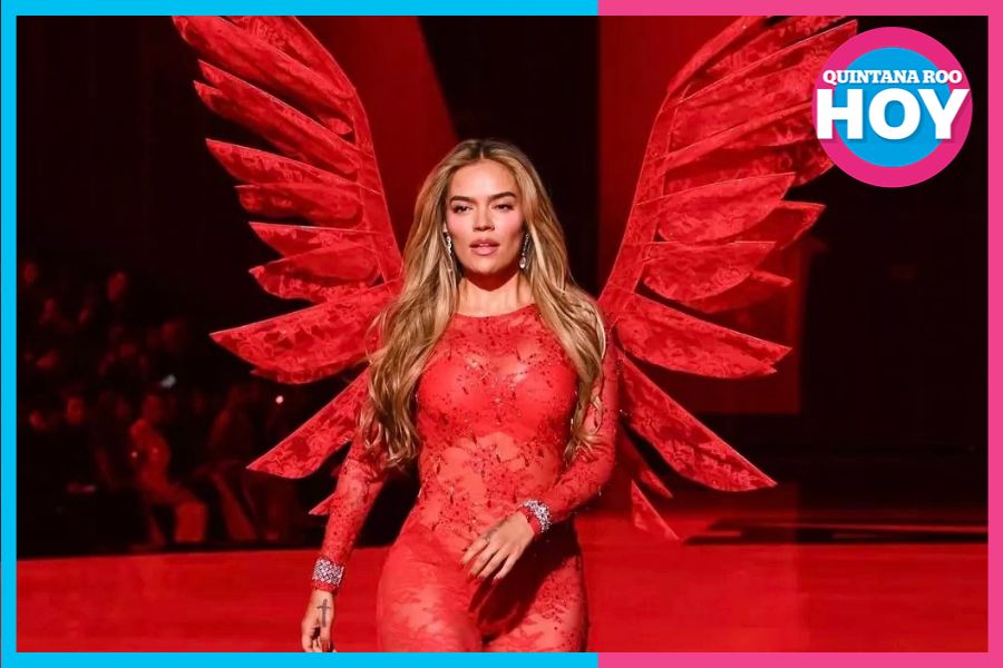 La colombiana deslumbró con un espectacular conjunto de encaje rojo con transparencias, manga larga y apliques de cristal. Tras su actuación, cumplió el sueño de lucir las emblemáticas alas de los ángeles de Victoria’s Secret, unas imponentes alas rojas con plumas de tela y estampado jacquard que completaron su potente y sensual look.