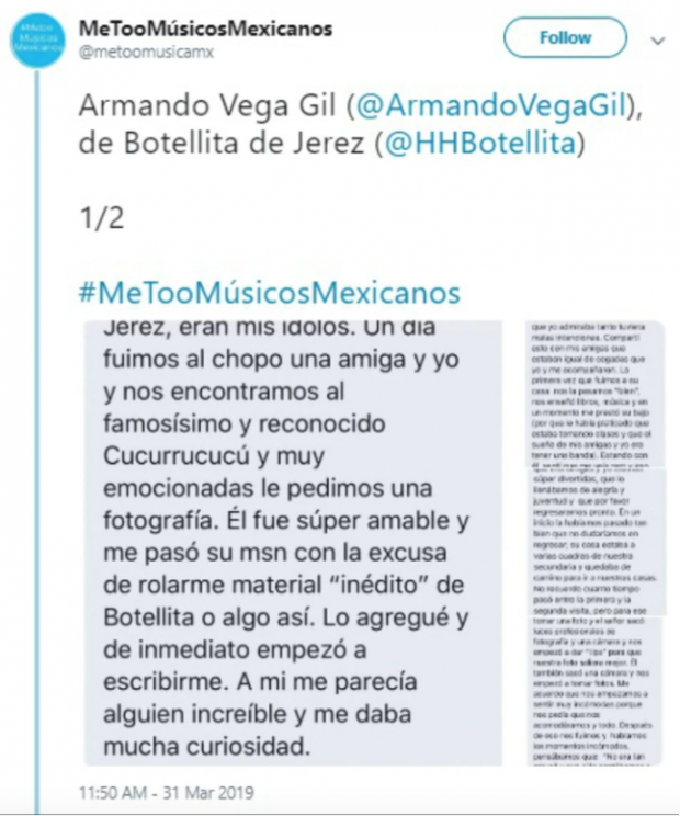 Hace unas horas, el integrante del grupo Botellita de Jerez, Armando Vega Gil, publicó a través de Twitter una carta póstuma con la que anunciaba su supuesto suicidio tras haber sido acusado de acoso y abuso sexual.