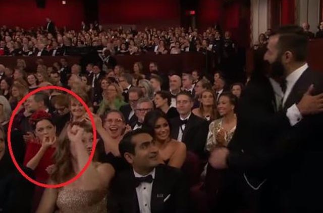 Durante la presentación de la 90 edición de los Premios Oscar, las cámaras enfocaron a distintas estrellas y la veracruzana, sentada junto al monstruo acuático de La forma del agua se recargó románticamente en su hombro para después alejarse pues, al parecer, el olor a pez no le agradó en lo absoluto.