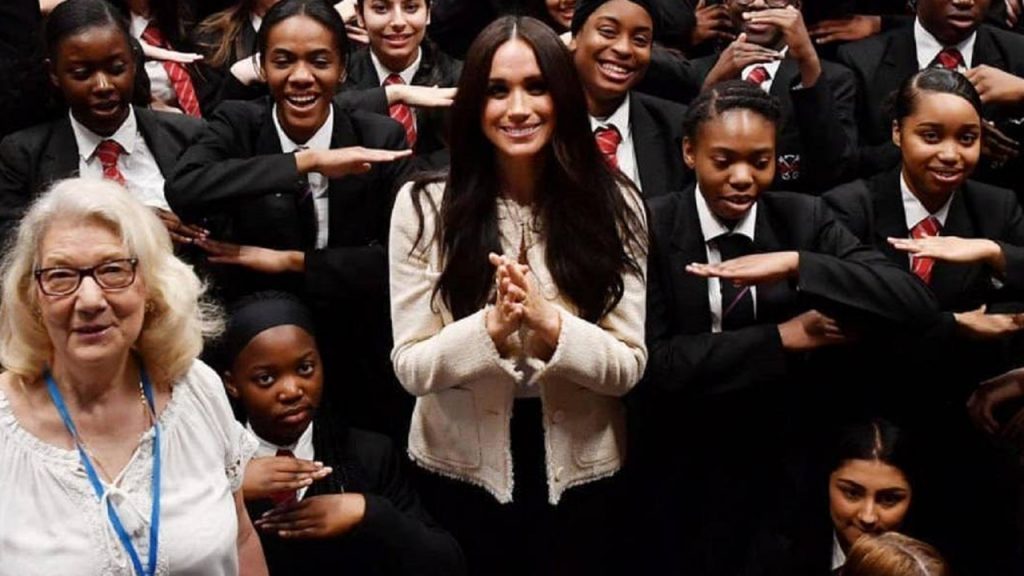 “Asegúrese de que se sientan valoradas y seguras. Unámonos todos juntos para que el Día Internacional de la Mujer sea algo que no sea solo el domingo, sino que se sienta francamente todos los días del año”, dijo la esposa del príncipe Harry a los alumnos del Escuela Superior Robert Clack en Dagenham.