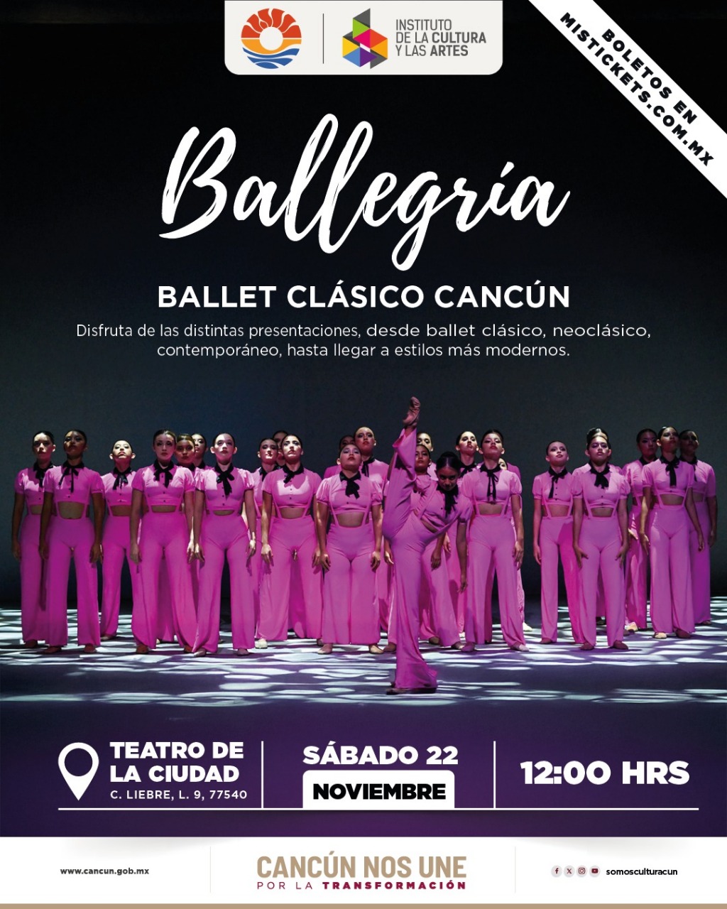 Cancún.- La elegancia, la técnica y la pasión se unirán sobre el escenario con Ballegría – Ballet Clásico Cancún, un espectáculo que promete emocionar al público a través de un recorrido por distintas expresiones del arte dancístico.