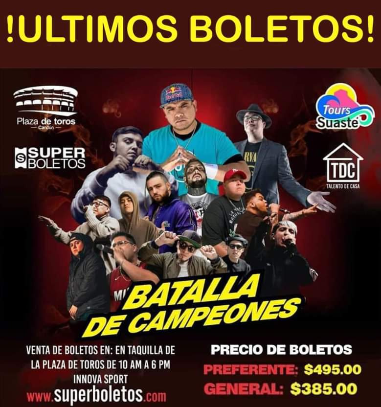 La batalla de campeones del freestyle llegará a Cancún, los mejores exponentes de este género invadirán la ciudad y harán subir la temperatura al enfrentarse en un ardiente duelo de rap e improvisación con temas libres, cada uno de los participantes se enfrentará con su contrincante para demostrar de que está hecho, el público será quien elija al ganador el próximo 26 de noviembre en punto de las 6:00 de la tarde, en la Plaza de Toros Cancún.
