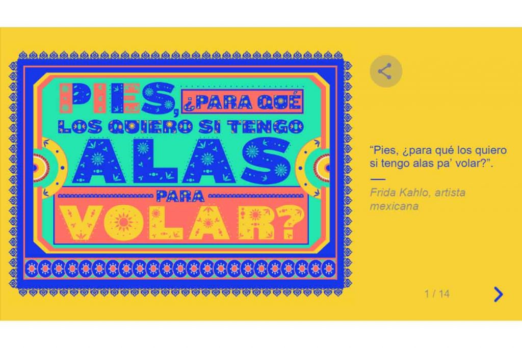 Luego de la imagen principal donde la palabra “mujer” se encuentra traducida en varios idiomas, se puede leer la frase de la artista mexicana Frida Kahlo “Pies, ¿para qué los quiero si tengo alas para volar?”.