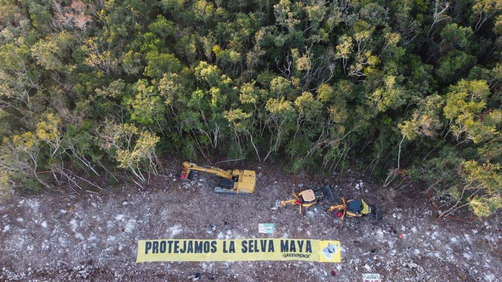 La organización desplegó una manta con el mensaje “Protejamos la selva maya”, mientras 8 activistas de la organización ambientalista inmovilizaron con sus cuerpos la maquinaria.