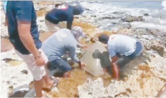 CHETUMAL. -La erosión de playas en Mahahual, así como el sargazo ocasionaron que una tortuga en edad adulta se atorara en las playas, la cual tuvo que ser rescatada por personal de la Agrupación Civil, Proyecto Aak Mahahual.