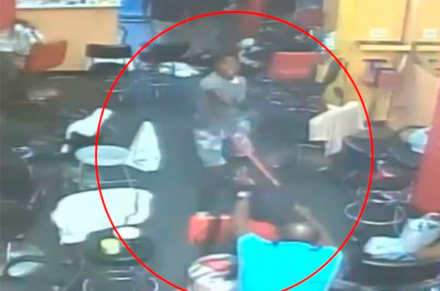 En ese momento el dueño del negocio reacciona y decide enfrentarlos con un palo de escoba.