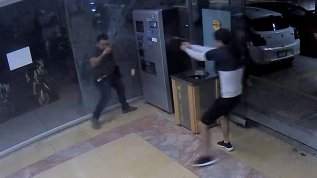 En imágenes de las cámaras de seguridad se puede ver cómo un hombre es atacado a balazos en el estacionamiento de la plaza comercial por dos sujetos.
