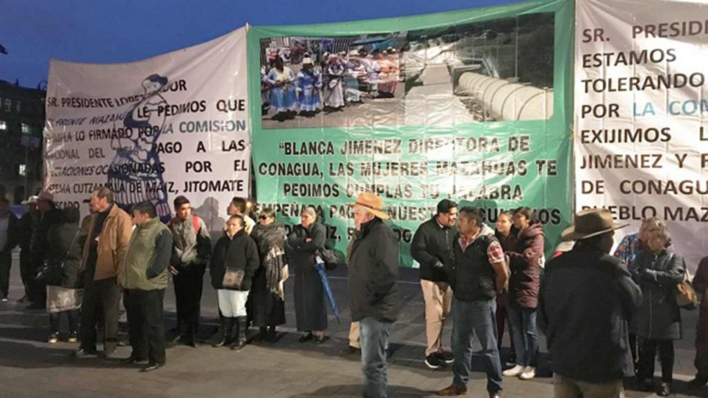 Miembros del Frente Mazahua protestaron frente a Palacio Nacional para exigir al Gobierno federal su intervención para que la Comisión Nacional del Agua (CONAGUA) se responsabilice de las pérdidas originadas por el Sistema Cutzamala a tierras de cultivo y criaderos de peces.