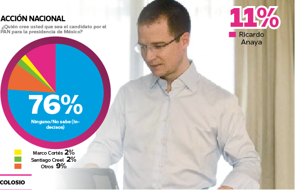 A la pregunta ¿Quién cree usted que sea el candidato por el PAN para la presidencia de México? Ricardo Anaya alcanza un 11 por ciento, el más alto de un grupo conformado por Marko Cortés, el dirigente nacional del partido albiazul que registra apenas 2 por ciento, igual que Santiago Creel, mientras otro bloque de aspirantes diversos llegan en conjunto a 9 por ciento.