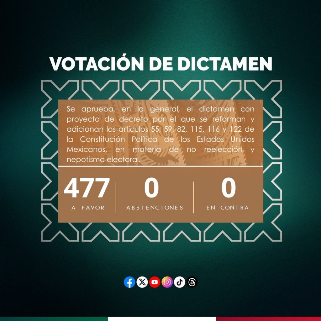 CIUDAD DE MÉXICO.- La Cámara de Diputados aprobó en lo general la reforma contra el nepotismo y la no reelección hasta 2030.