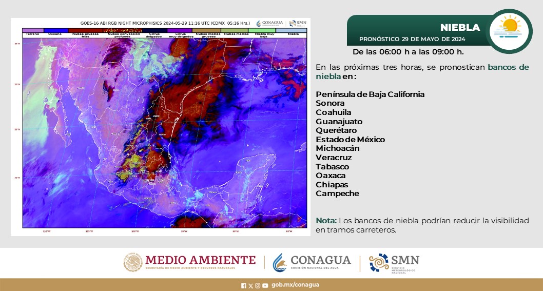 Viento con rachas de 40 a 60 km/h: Campeche, Yucatán y Quintana Roo; y con posibles tolvaneras: Baja California, Sonora, Michoacán, Guerrero, Morelos, Tlaxcala, Puebla, Veracruz, Oaxaca y Chiapas.