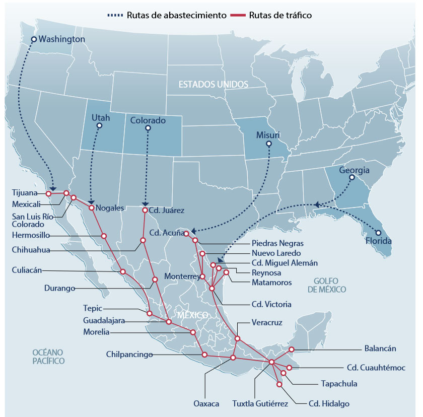 De acuerdo con la información contenida en el Segundo Informe Semestral de Actividades de la Fuerza Armada Permanente en tareas de Seguridad Pública, las armas salen de Washington, Utah, Colorado, Misuri, Georgia y Florida y entran por Tijuana, Nogales, Ciudad Juárez, Ciudad Acuña y Ciudad Miguel Alemán; cruzan todo el país por tres principales rutas que llegan a Tuxtla Gutiérrez y de ahí salen a Balancán (Tabasco), Ciudad Cuauhtémoc, Tapachula y Ciudad Hidalgo (Chiapas).