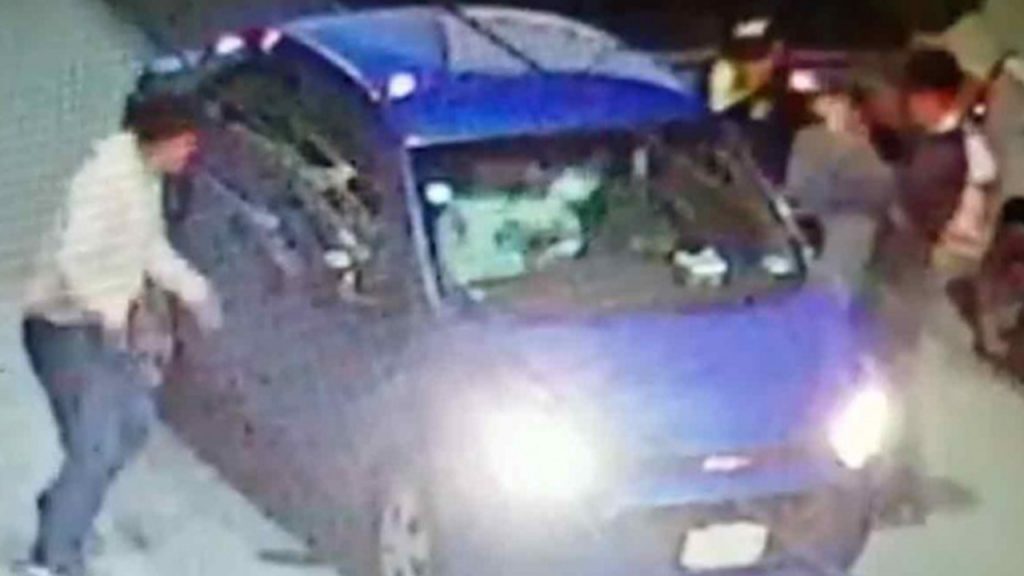En las imágenes se observa a los delincuentes que se acercan a un vehículo compacto color azul y mientras uno amaga al conductor, su cómplice abre la puerta del copiloto para sacar los objetos de valor. Un tercer sujeto aparentemente se va al vehículo de enfrente, pero éste avanza y el individuo regresa.