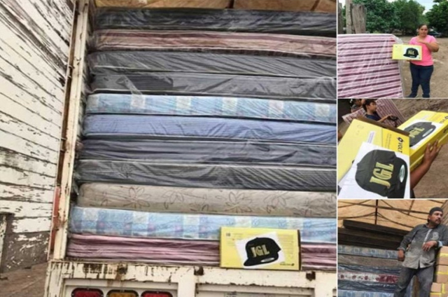 En las fotografías se observan colchones empacados y cajas amarillas con parrillas eléctricas que tienen pegadas una etiqueta con las siglas “JGL” escritas con letras doradas, lo que ha hecho la donación se adjudique a Joaquín Guzmán Loera.