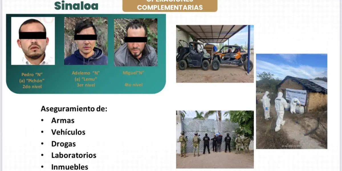Los detenidos fueron identificados como Adelemo “N”, alias “Lemu”, presunto operador logístico, y Miguel “N”, señalado como sicario. En paralelo, la Marina aseguró dos laboratorios clandestinos en Guasave y Ahome, acción que, según el secretario Raymundo Pedro Morales Ángeles, impactó directamente la capacidad productiva del Cártel de Sinaloa.
