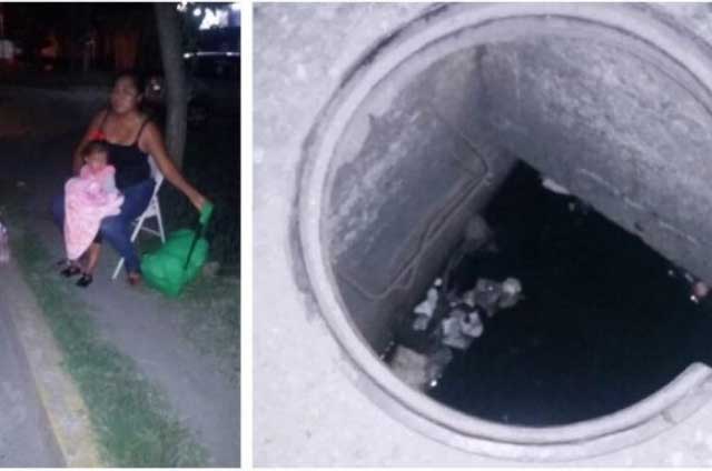 La mujer expresó que debido a la falta de alumbrado público y la falta de alcantarillado, no vió el registro y cayó cuando llevaba a su hija en brazos, además de unas bolsas.