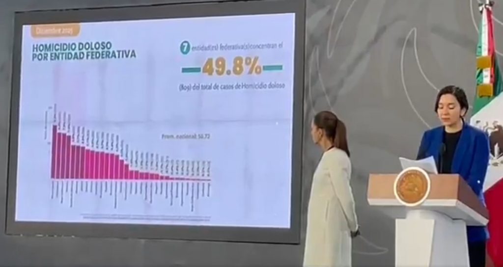 “De septiembre de 2024 a diciembre de 2025 los homicidios dolosos bajaron en 40 por ciento. Con el cierre de diciembre de 2025”, señaló Sheinbaum Pardo durante su conferencia matutina, realizada este jueves 8 de enero en Morelos.