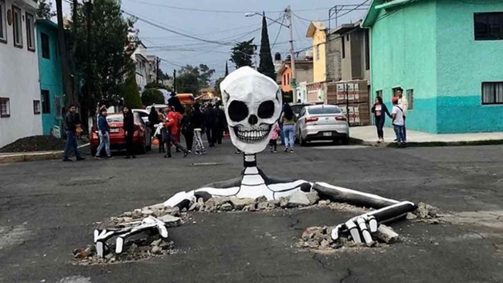 Una calavera gigante que emerge de calles de la colonia Santa Cecilia en Tláhuac ha causado furor en redes sociales. El esqueleto aparentemente rompe con el pavimento de la calle Francisco Santiago Borraz.
