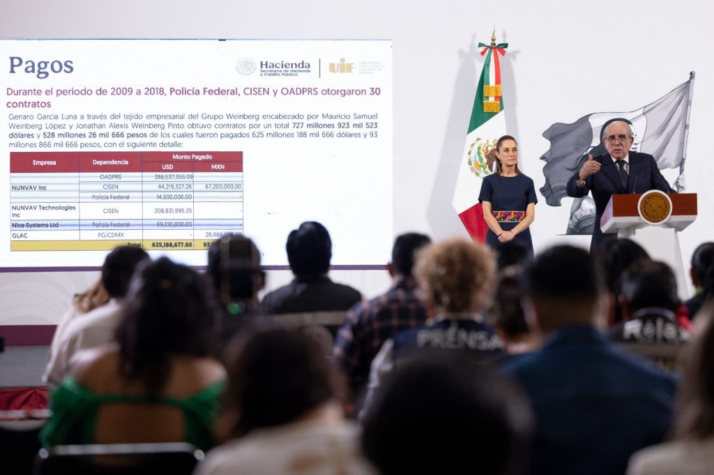 Gómez explicó que García Luna, a través del Grupo Weinberg, encabezado por Mauricio Samuel Weinberg López y Jonathan Alexis Weinberg Pinto, obtuvo contratos por 727.9 millones de dólares y 528 millones de pesos, de los cuales se pagaron 625.1 millones de dólares y 93.8 millones de pesos.