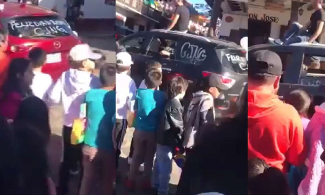 En otro video, se aprecia a individuos saludando y grabando desde los autos, con la escolta aérea de un helicóptero. La escena, descrita como una comitiva, muestra a niños y niñas recibiendo regalos de los presuntos miembros del cártel.