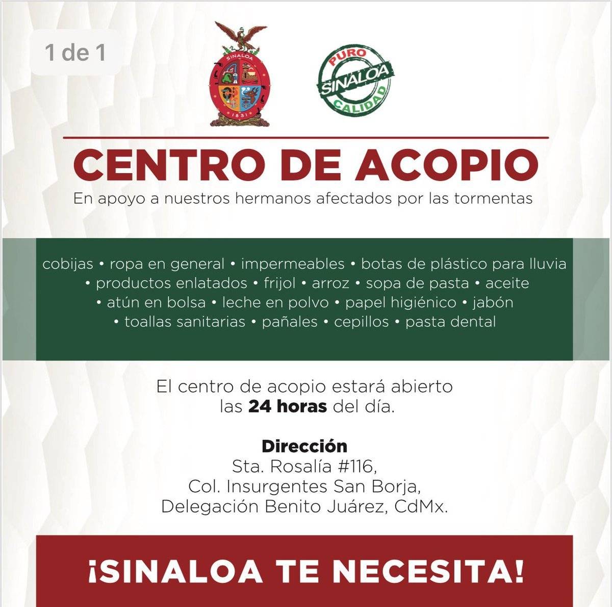 Tras las inundaciones y afectaciones en Sinaloa miles de mexicanos se han volcado en ayudar a los damnificados. La representación del gobierno de Sinaloa en la Ciudad de México abrió un centro de acopio para juntar víveres. Esta es la lista de otros sitios.
