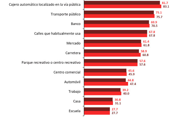 El 81.7% de la población siente inseguridad en los cajeros automáticos localizados en la vía pública, 75.1% en el transporte público, 69.9% en el banco y 67.8% en las calles que habitualmente usa.