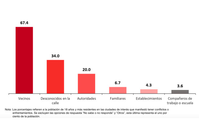 manera directa por causa de incivilidades en su entorno, 67.4% mencionó que estos conflictos se dieron con los vecinos, mientras que 34% manifestó haber tenido conflictos o enfrentamientos con desconocidos en la calle.