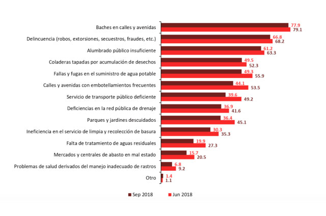 El 77.9% de la población de 18 años y más manifestó como uno de los problemas más importantes en su ciudad la existencia de “baches en calles y avenidas”; 66.8% la “delincuencia (robos, extorsiones, secuestros, fraudes, etc.)”, y 61.2% consideró el “alumbrado público insuficiente”.