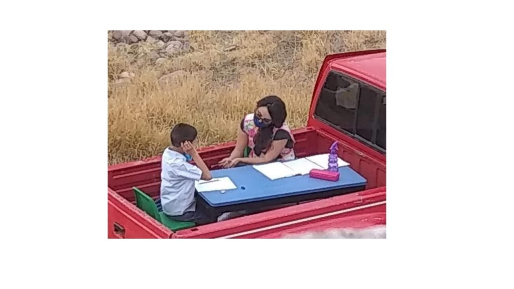 Tras el cierre de escuelas por la emergencia sanitaria del coronavirus SARS-CoV-2, esta maestra de nombre Nay, adaptó con una mesa y dos sillas la parte de carga de una camioneta en la que visita a a cada uno de sus estudiantes.