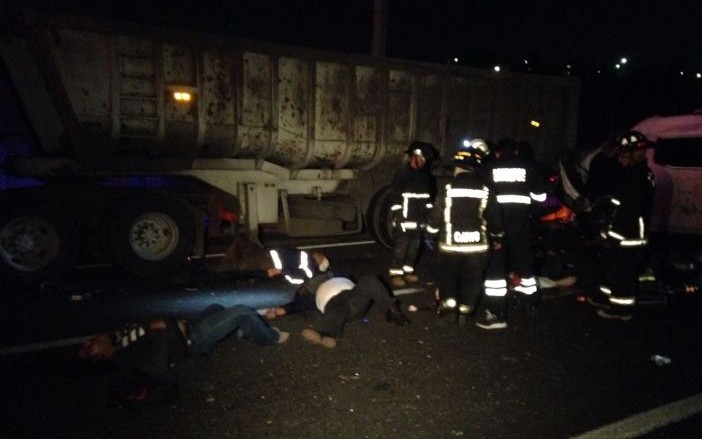Tlanepantla, Estado de México.- Al menos doce personas perdieron la vida al chocar la unidad de transporte público de pasajeros y un tráiler-góndola en la carretera México-Pachuca a la altura de la colonia Xalostoc.