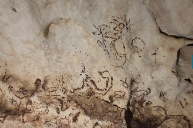 Las pinturas están impresas en una roca de aproximadamente 15 metros de largo y cinco de alto en esa cueva hallada en la parte oriental del estado de Yucatán, en el sureste de México, que también alberga un pequeño cenote de aguas azules.
