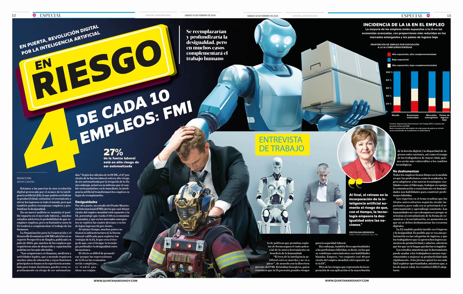 Por otra parte, un estudio del Fondo Monetario Internacional (FMI) alerta que casi 40 por ciento del empleo mundial está expuesto a la IA, porcentaje que ronda el 60 en economías avanzadas, y que en los mercados emergen- tes se repiten las cuatro decenas y en los de bajos ingresos 26 por ciento.