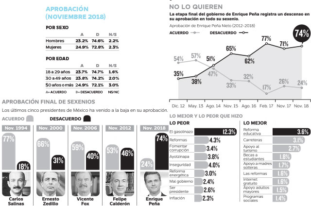 La aprobación con la que han terminado los recientes cinco presidentes de México ha ido a la baja. En noviembre de 1994, Carlos Salinas concluyó con 77% de aprobación; Ernesto Zedillo lo hizo en el 2000 con 66%, y Vicente Fox en el 2006 de panzazo con 59%. Los que no aprobaron fueron Felipe Calderón en el 2012 con 53%, y Enrique Peña en el 2018 con un pobre 24%.