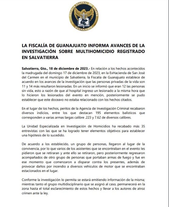 La Fiscalía de Guanajuato indicó que inicialmente se informó que eran 12 los muertos por el ataque en Salvatierra debido a que ingresó al hospital un lesionado a la misma hora que otros heridos del evento; sin embargo, “posteriormente se pudo establecer que este doceavo no estaba relacionado con los hechos citados”.Además, señaló que una de las hipótesis del ataque es que los asistentes a la posada impidieron el ingreso a un grupo de personas ajenas al evento, quienes se retiraron del lugar, pero más tarde regresaron y dispararon con armas de grueso calibre contra quienes se encontraban en la exhacienda de San José del Carmen.