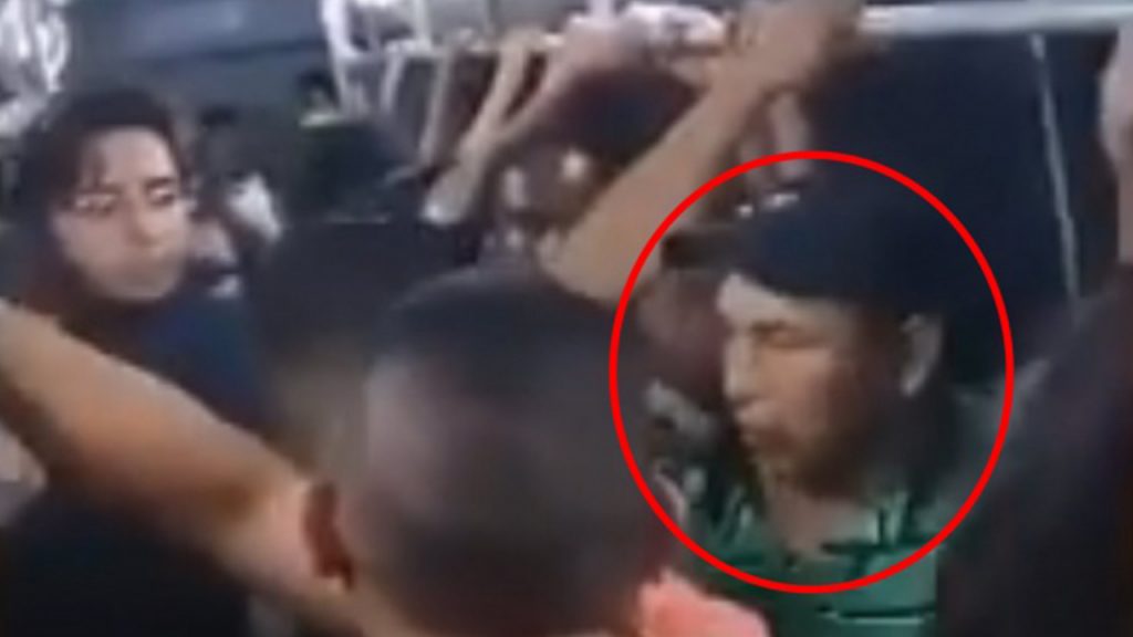 La demás gente en el transporte público empieza a reaccionar y a voltear a ver al acosador, mientras avanza por el pasillo.