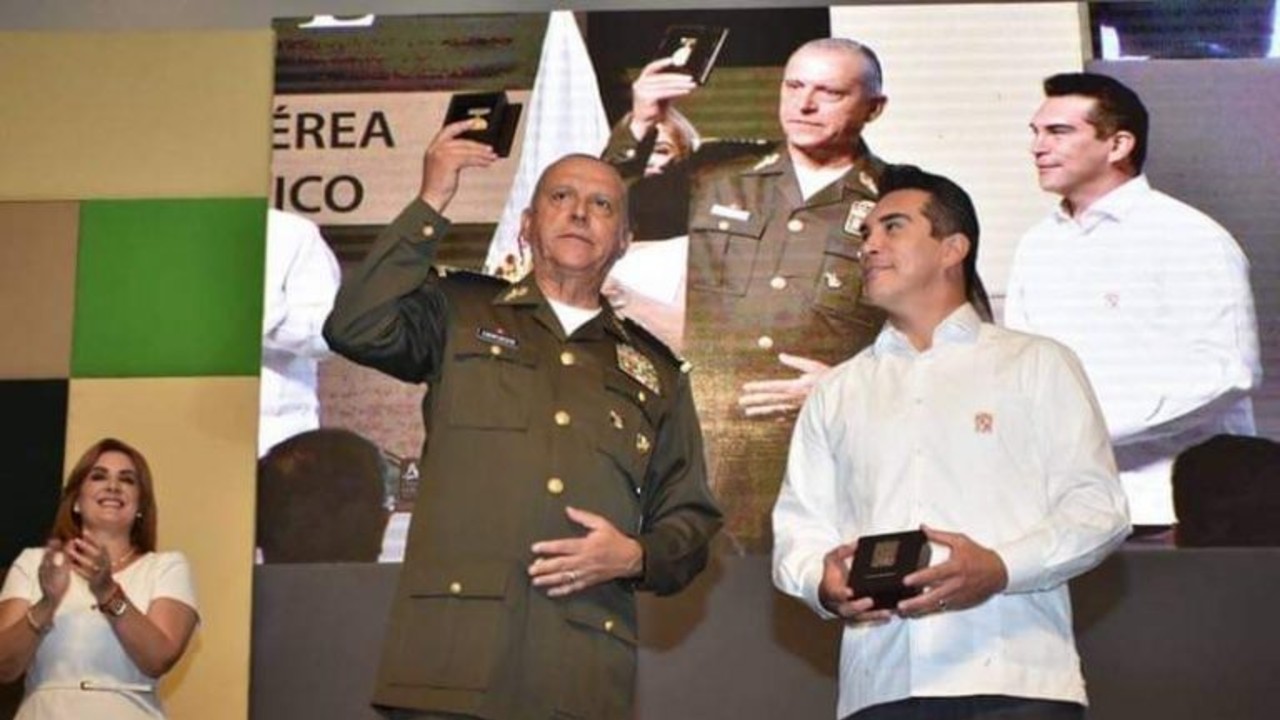 CAMPECHE.- En 2018, durante la gubernatura de Alejandro Moreno Cárdenas, el exsecretario de Defensa Nacional, Salvador Cienfuegos Zepeda, recibió el “Premio Campeche”, el mayor galardón por el gobierno de ese estado.