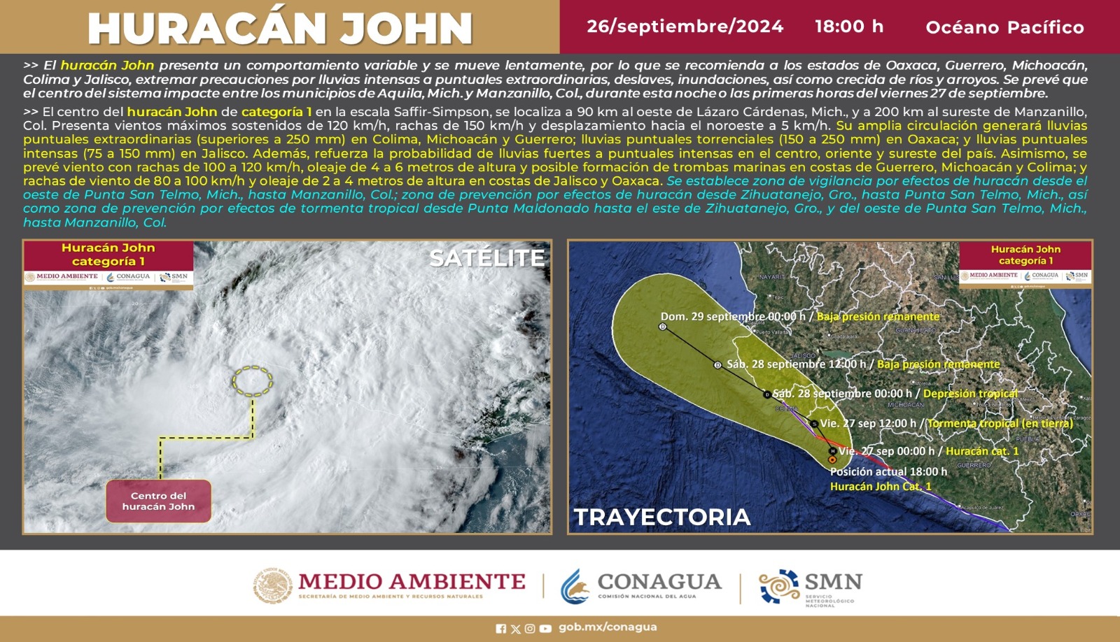 MICHOACÁN.- El huracán John, tras alcanzar la categoría uno en la escala Saffir-Simpson, presenta un comportamiento errático mientras se mueve lentamente hacia las costas de Michoacán, amenazando con un impacto inminente. Este sistema, que se formó en el Océano Pacífico, se encuentra a 90 km al oeste de Lázaro Cárdenas y a 200 km al sureste de Manzanillo, Colima, con vientos sostenidos de 120 km/h y rachas que alcanzan los 150 km/h.