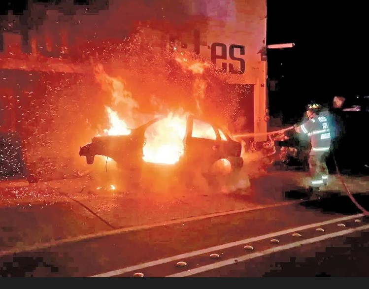 A las 23:41 horas, se reportó el fuego en un vehículo Nissan Tsuru color blanco, mismo que fue asegurado por elementos de la Secretaría de Seguridad Pública municipal para tomar evidencias.