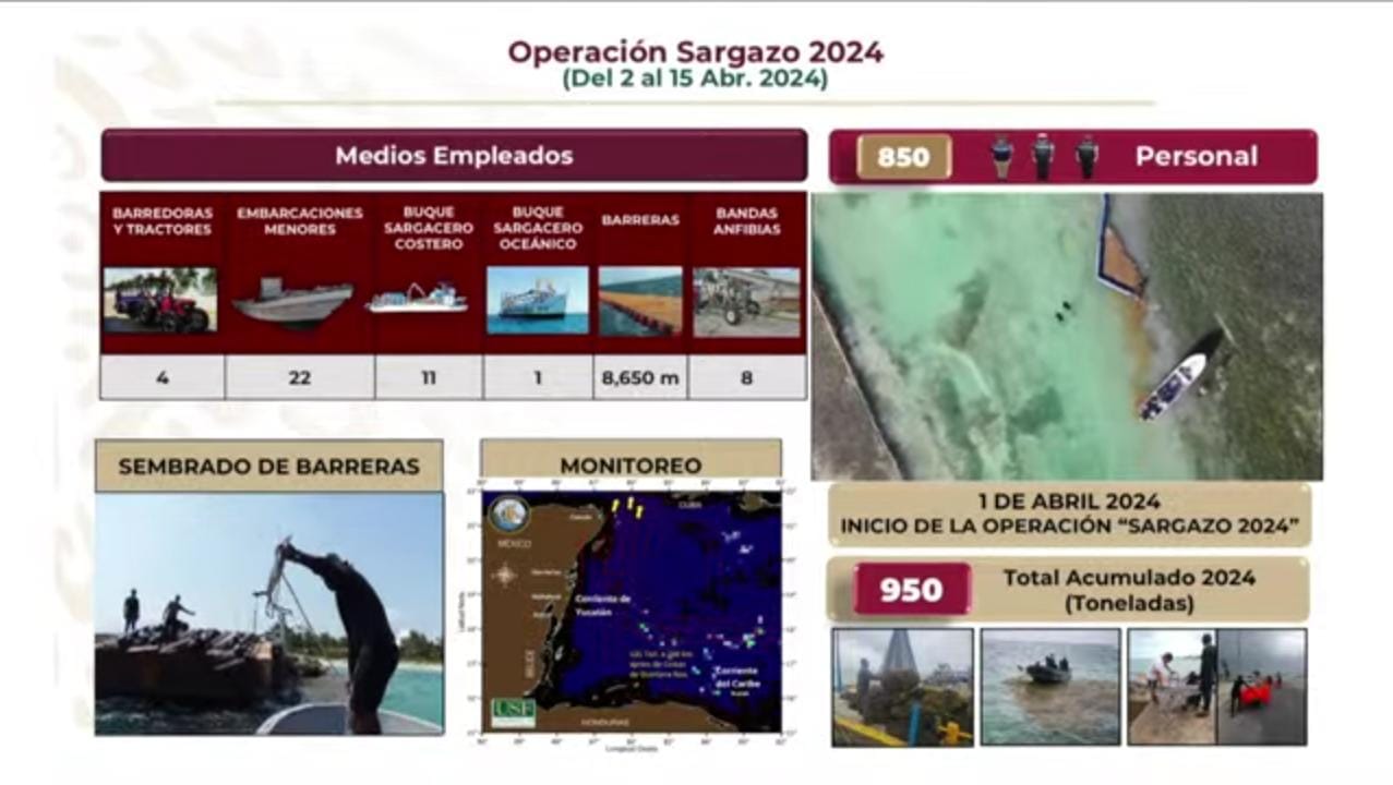 Detalló que para llevar a cabo esta labor, la Semar ha dispuesto en total cuatro barredoras, 22 embarcaciones menores, 11 sargaceras, un buque oceánico y ocho bandas anfibias.