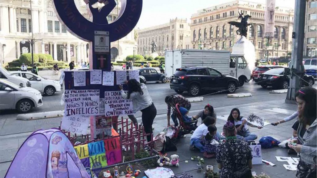 Las activistas han colocado juguetes, flores, una casita de campaña, ropa de niña, dibujos con rostros de niñas, niños y sus nombres quienes han sido víctimas de violencia, entre ellos el de Fátima.