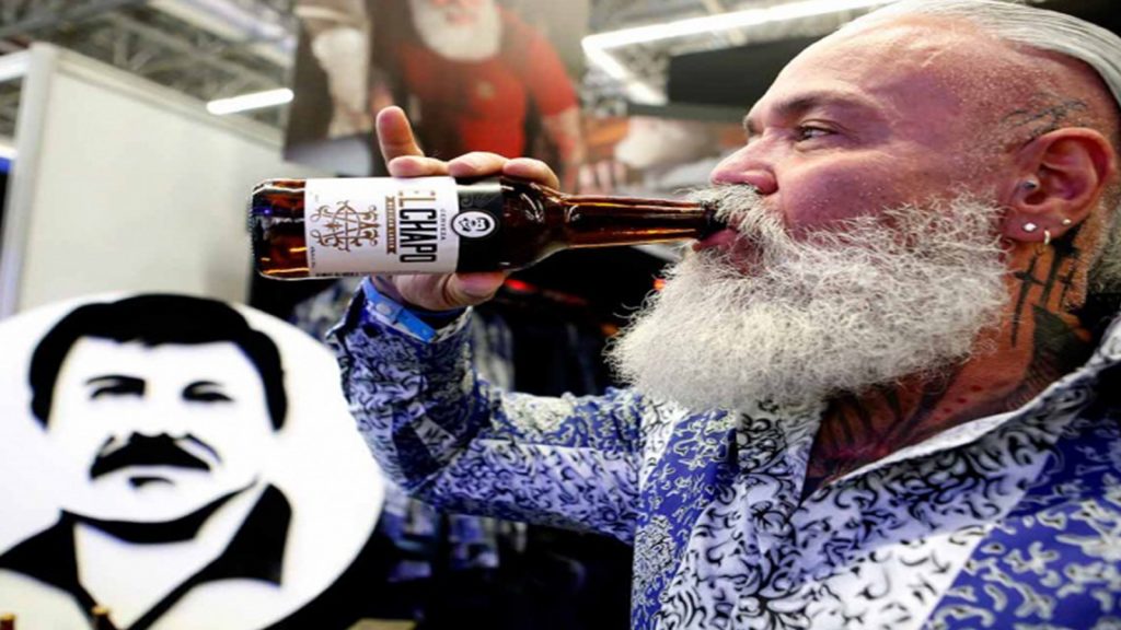Una etiqueta en una gama de negro, marrón y blanco envuelve la botella de “El Chapo Mexican Lager” (de 4% de graduación alcohólica). Dentro de un círculo, el famoso rostro del bigotudo narcotraficante completa el diseño.