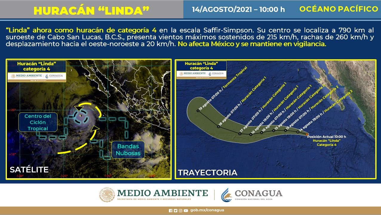 El Servicio Meteorológico Nacional, organismo dependiente de la Conagua informó que el Huracán Linda se intensificó a categoría 4; el SMN detalló que el meteoro se aleja de las costas del Pacífico Mexicano.