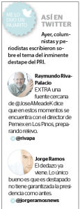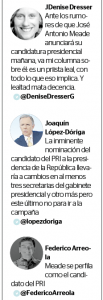 El también periodista puntualizó que, según una “versión en Insurgentes Norte” –donde se ubica la oficina nacional del PRI–, José Antonio Meade será el candidato presidencial, mientras que Nuño Mayer se encargará de la campaña y el exgobernador del Estado de México, Eruviel Ávila, será el presidente nacional del partido.