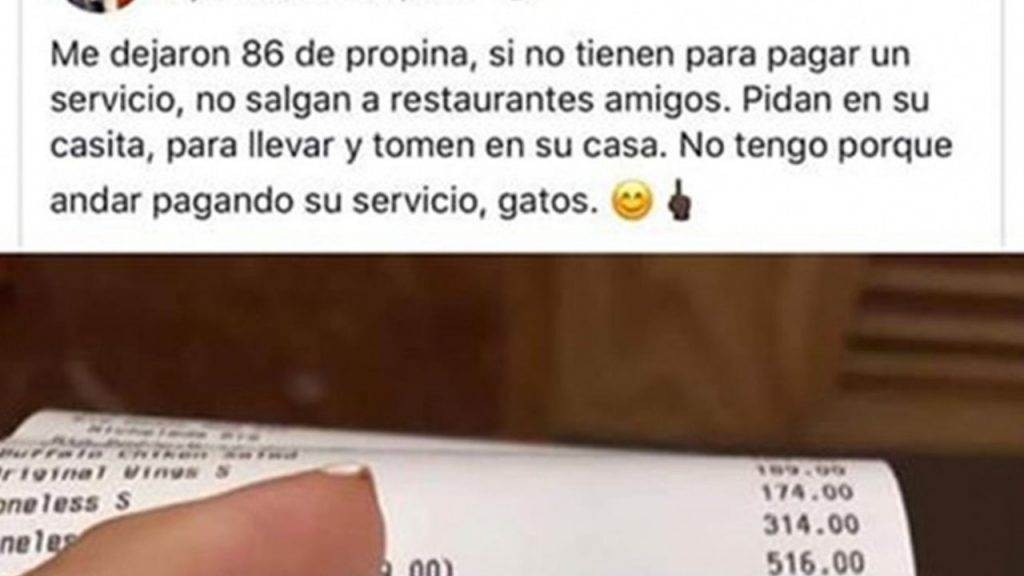 “Me dejaron 86 de propina, si no tienen para pagar un servicio, no salgan a restaurantes amidos. Pidan en su casita, para llevar y tomen en su casa. No tengo porque andar pagando su servicio, gatos”, comentó la mujer.