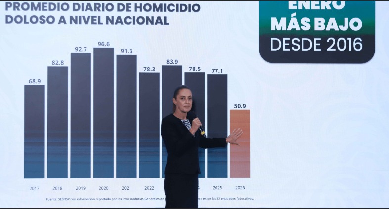 Ciudad de México.- Los homicidios en México registraron una caída del 42 por ciento entre septiembre de 2024 y enero de 2026. Así lo informó el Gabinete de Seguridad con cifras preliminares. El periodo corresponde a los primeros 16 meses del gobierno de Claudia Sheinbaum.