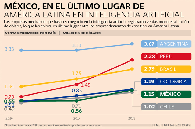 México.– Los emprendimientos que basan su negocio en técnicas de Inteligencia Artificial están rezagados en México. Mientras que las ventas de este tipo de compañías durante 2017 en Argentina, Brasil y Perú oscilaron entre 1.75 y 3.33 millones de dólares, las mexicanas apenas rebasaron el millón en ingresos, de acuerdo con el reporte El impacto de la inteligencia artificial en el emprendimiento elaborado por Endeavor en colaboración con Everis.