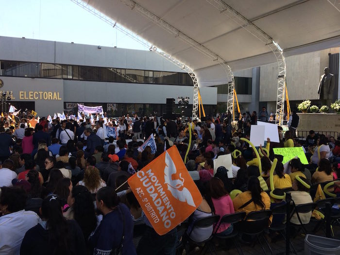 Una hora antes de la llegada de Ricardo Anaya al INE, unos 100 integrantes de la comitiva del quinto distrito [Azcapotzalco] de MC llegaron a Viaducto Tlalpan para apoyarlo.