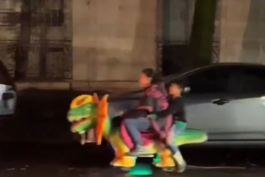 México.- Una escena inusual captada en las calles capitalinas ha capturado la atención de usuarios en redes sociales. En un video viral compartido en la plataforma X (antes Twitter), se observa a una mujer circulando por la vía pública a bordo de un dinosaurio de plástico motorizado, acompañada por un menor y sin portar cascos ni medidas de seguridad.